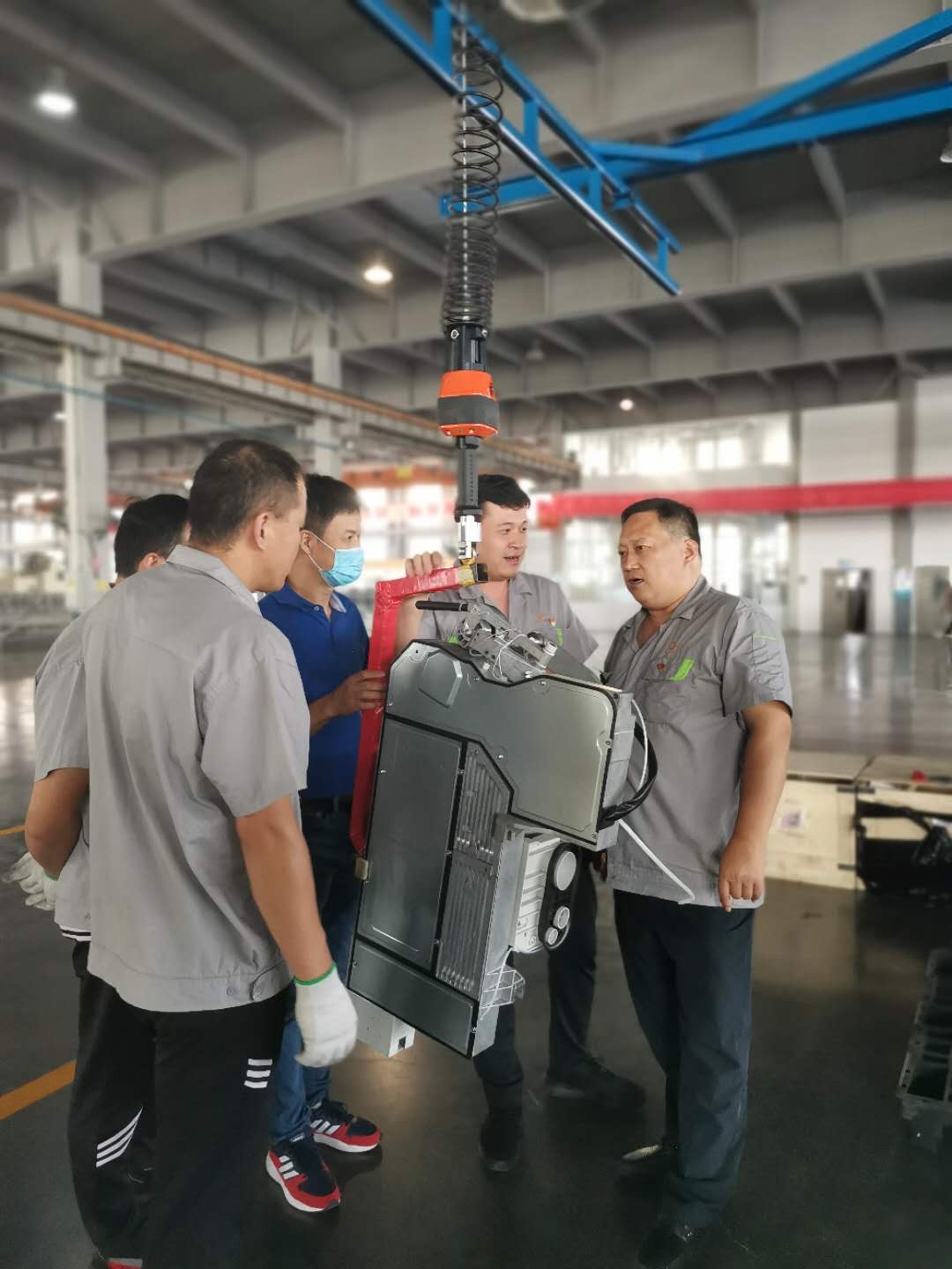 現(xiàn)場情況:組裝生產(chǎn)線,工件重量15公斤左右,現(xiàn)場配大行車。由于工件不是太重,節(jié)拍比較快,行車使用效率低下,噪音大,工人不愿使用行車,多數(shù)情況下使用人搬運,勞動強度很大。